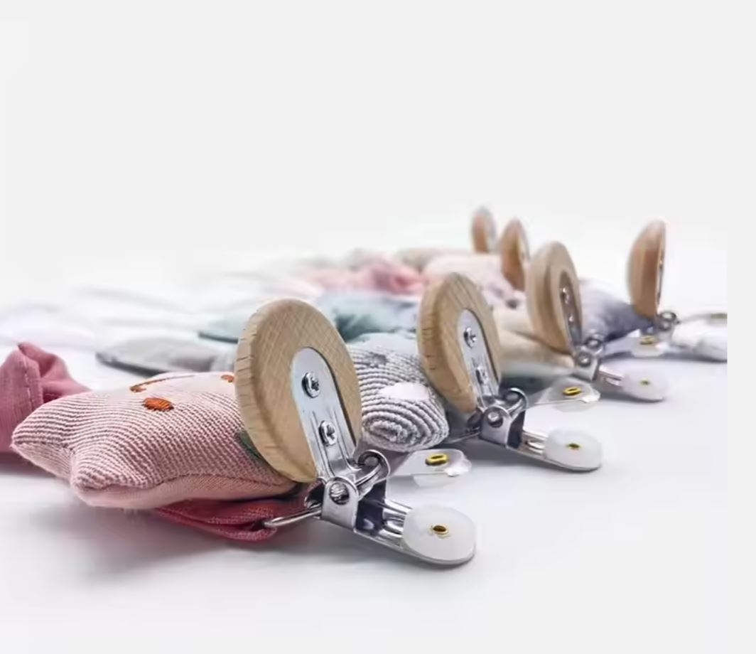 Gardez la sucette de bébé toujours à portée de main avec ce clip en bois naturel, à la fois pratique et plein de charme.